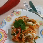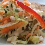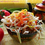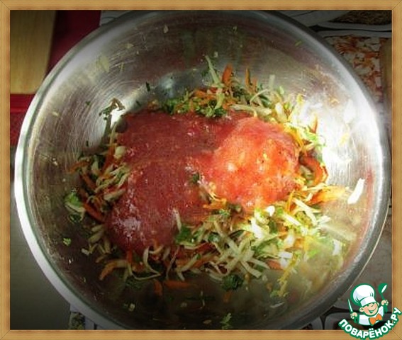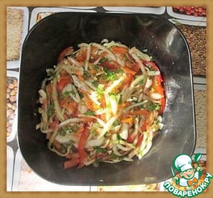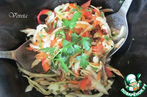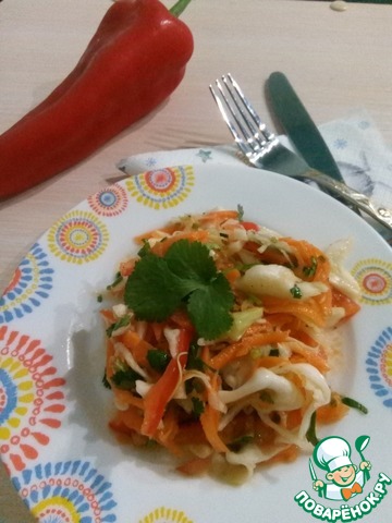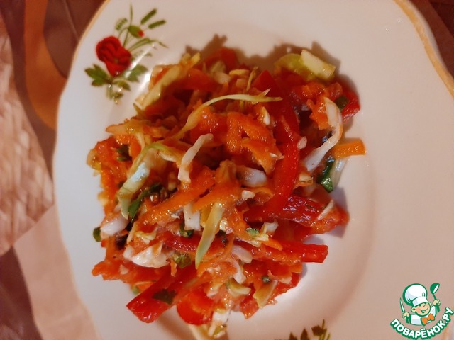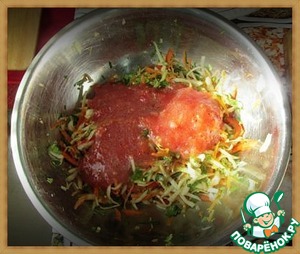 В миску к капусте и перцу добавляем морковь, чеснок, кинзу. Сверху - томатно-лимонную смесь. Перемешиваем.