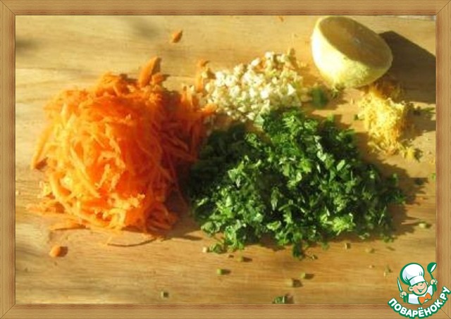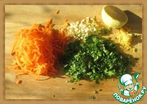 Морковку натираем на терке, чеснок и кинзу измельчаем, с целого лимона снимаем теркой цедру и выжимаем сок из половинки лимона -