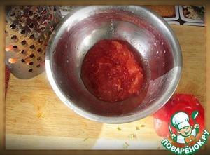 Помидоры разрезаем пополам и натираем на терке шкуркой наружу так, чтобы она осталась в руке