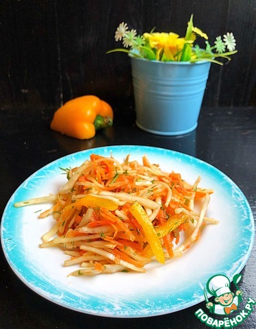 Капусту и перец нарезаем тонкой соломкой, складываем в миску, присыпаем солью и несильно перетираем руками.