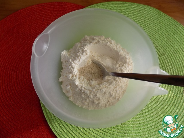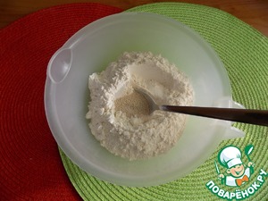 Делаем тесто. Смешиваем сухие ингредиенты: муку, сахар, соль и дрожжи в посуде, где будем замешивать тесто.
