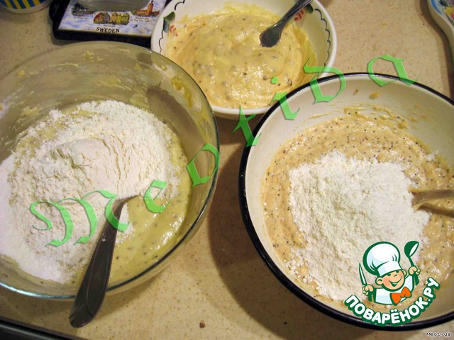 в тесто добавляем 2 стакана муки и разрыхлитель