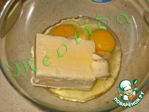 маргарин растираем с яйцамии сахаром, добавляем йогурт и все тщательно перемешиваем