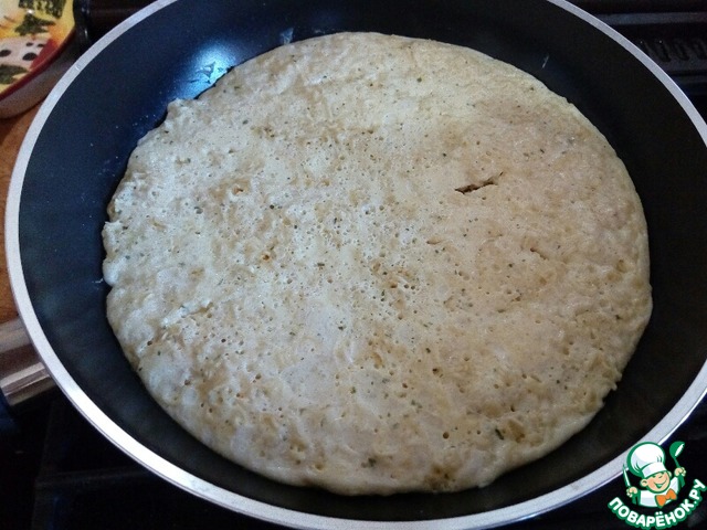 Сковороду слегка разогреть с подсолнечным маслом. Аккуратно вылить смесь и разровнять ложкой по всей поверхности. Вообще сковороду лучше брать с антипригарным покрытием.