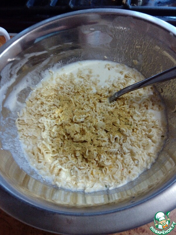 Добавить кипяченую охлажденную воду. Все хорошо перемешать. Раскрошить лапшу и добавить специи из пакетика, соду. Масло в пакетике я не использую. Еще раз хорошо перемешать. Лапшу лучше брать именно Роллтон!!! С другой вкус получается не таким ярким!!