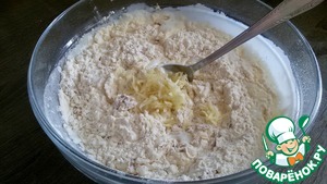 К сухим ингредиентам добавить кефир и растительное масло, натертый на мелкой терке чеснок. Замесить тесто.