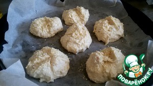 Разделить тесто на пять частей, смоченными водой руками быстро сформировать булочки и выложить на противень, застеленный бумагой для выпечки. Посыпать кунжутом.