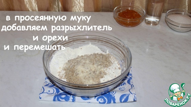 В просеянную муку добавляем разрыхлитель, орехи. Хорошо перемешиваем.