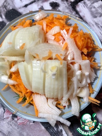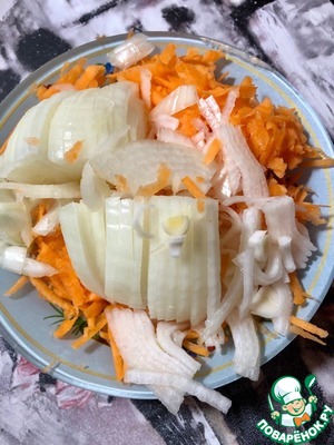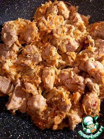 Промываем свинину и режем на небольшие кусочки. Маринуем мясо минут 10-15 - добавляем сметану, приправу "Для шашлыка", перец (фото данного процесса не получилось сделать). Тем временем, подготавливаем овощи - шинкуем тонко полукольцами лук и трем на крупной терке морковь.