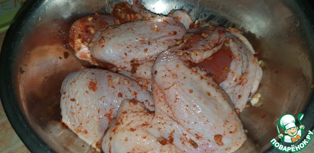 Куриные бедра помыть, обсушить, натереть специями для курицы, солью и измельченным чесноком. Мариновать 15-20мин. У меня в этот раз были бедра, голени и крылья.