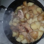 дополню - маслом смазала дно, курица не пригорела, картошка не развалилась, дырочку на крышке заткнула ватной палочкой =)