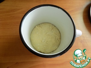 Нам нужно отварить грибы в подсоленной воде. Это можно сделать заранее. Делаем тесто. Муку смешиваем с сахаром и солью в посуде. Делаем углубление и наливаем в муку тёплую воду и подсолнечное масло. Замешиваем тесто сначала ложкой, а затем руками, смазав их маслом. Тесто липкое. Скатываем в шар, перекладываем тесто в эмалированную посуду и даём ему постоять, пока делать будем начинку.