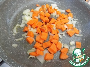 На сковороду налила масло подсолнечное холодного отжима, разогрела его и выложила лук, порезанный мелко. Следом-кубиком мелким порезанную морковь. Убавила огонь и под крышкой потомила.