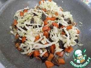 Положила порезанную тонко пекинскую капуста. Она готовится очень быстро. Минут через 5 посолила, перемешала и сняла с огня. Начинка готова.