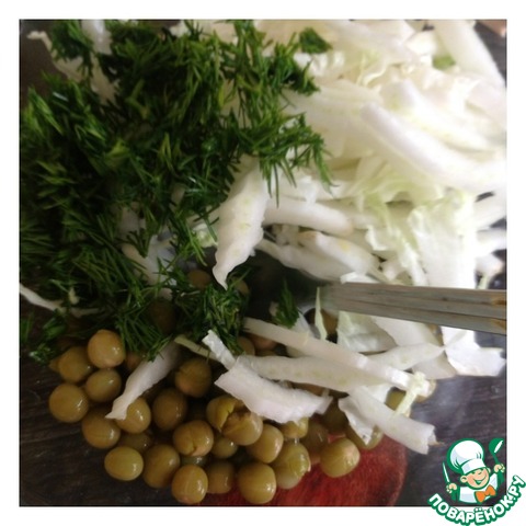 Капустку нашинковать полосками, укроп мелко нарезать. С горошка слить лишнюю жидкость и добавить к салату.