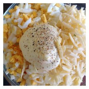 Сыр натереть на крупной терке, яйца нарезать кубиком. Добавить специи и майонез. Салат перемешать.