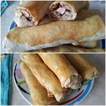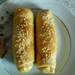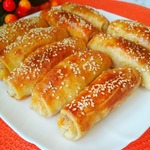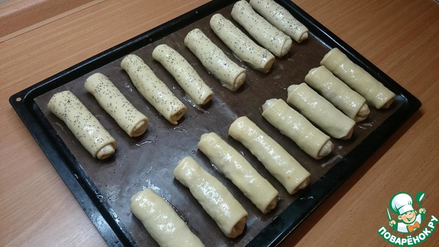 Перекладываем швом вниз на смазанный маслом или застеленный силиконовым ковриком противень. Я делаю трубочки в двух вариантах: с соусом и без. Чтобы их различать, смазываю трубочки яйцом и посыпаю часть маком :)