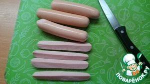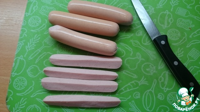 Сосиски очищаем от оболочки и разрезаем на 4 части.