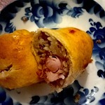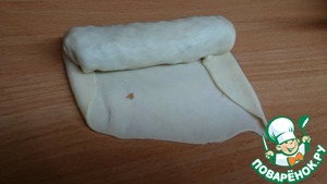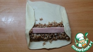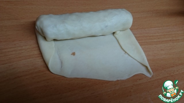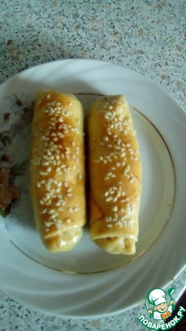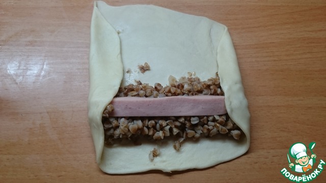 Каждую часть раскатываем в пласт толщиной 1-2 мм. На край выкладываем гречку, сверху сосиску и по желанию томатный соус классический или с ароматными травами.