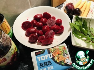 Предлагаю, дорогие Поварята, салат из консервированной свеклы и тофу с добавлением свежего инжира, зеленью. Салат диетический, по вашему вкусу можете добавить любую зелень. Свекла из банки придаёт салату немного остроты для тофу и зелени. Не проходите мимо.