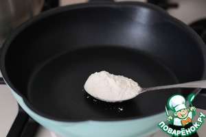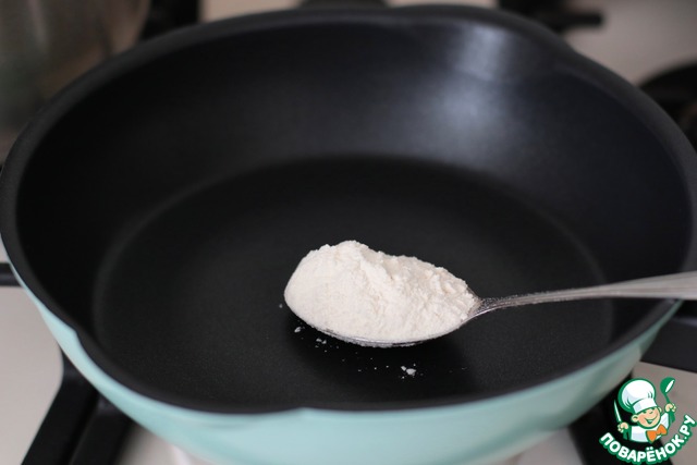 Обжарить муку до светло коричневого цвета на медленном огне. Благодаря сухой обжарке муки, соус приобретет легкий ореховый вкус.