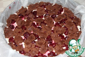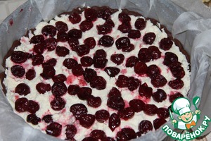 Выложить начинку в форму с подготовленным тестом. Поверх творога уложить вишню (свежую, мороженую или из компота).