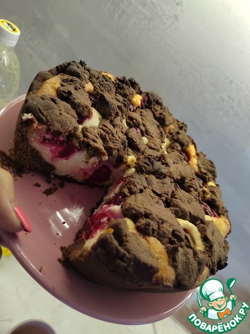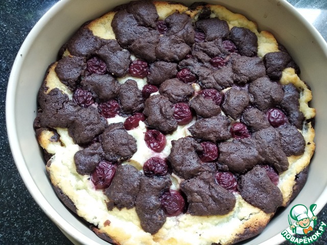 Замечательное сочетание творога и вишни, оригинальный внешний вид этого пирога, буквально, заставили меня его испечь в тот же день, когда я его нашла в Интернете. Несложно, вкусно! Любителям творога, вишни и шоколадного теста! Творог выбирайте не очень плотный, либо стоит увеличить жидкие компоненты в начинке, чтобы получилась паста, в которой можно "притопить" вишни. Мои не тонули!!!