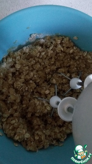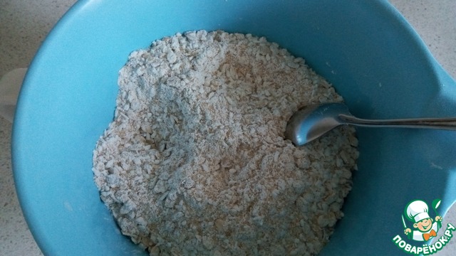 В отдельной емкости смешиваем муку, сахар, овсяные и кокосовые хлопья, разрыхлитель.