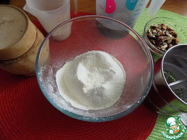 Муку просеиваем в посуду, где будем замешивать тесто. Добавляем в неё соду и соль, перемешиваем.