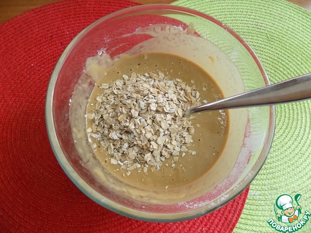 Замешиваем тесто и насыпаем овсяные хлопья. Я всегда использую грубые хлопья или Геркулес. Даём постоять минут 10, чтобы хлопья немного разбухли.