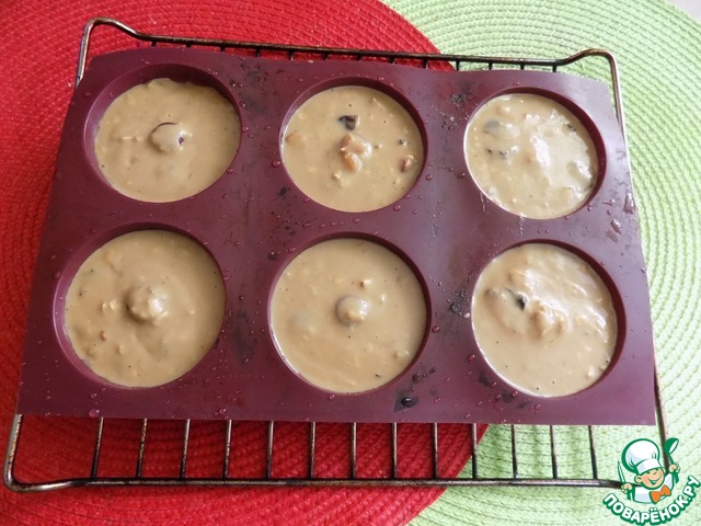 Я буду использовать силиконовую форму для кексов. На ней помещается 6 шт кексов среднего размера. Количество получившегося теста разливается ровно на 6 шт. Немного до верха тесто не доливаем. В процессе выпечки они подрастут. Ставим форму в разогретую духовку до т-180 С на 15-20 минут. Ориентируйтесь по своей духовке. У меня небольшой эл. шкаф на 15 л, с элементами снизу и сверху. Печёт очень быстро.