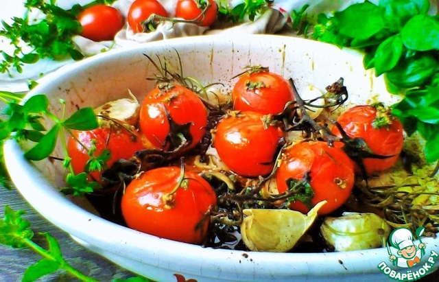 Большое спасибо автору, рецепт помог "спасти" абсолютно безвкусные помидоры. У меня без чеснока и тимьяна, посыпала прованскими травами и подсолила немного. Получилось вкусно и симпатично!