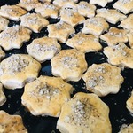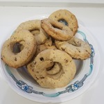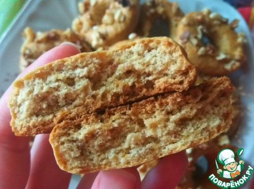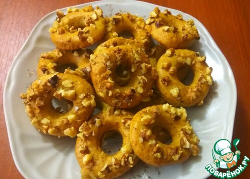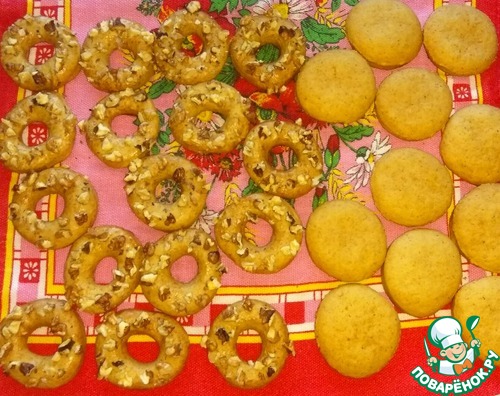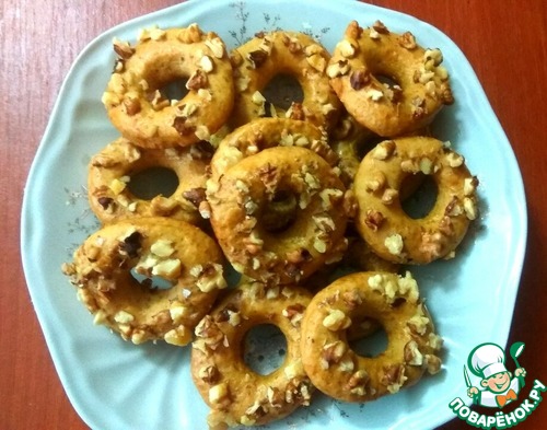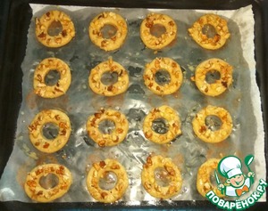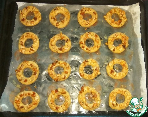 Выложить на застеленный пергаментом противень наши колечки. Смазать яйцом, посыпать измельченными орехами. Выпекать в разогретой до 180 градусов духовке примерно 12 минут. Сильно не зарумянивать.
