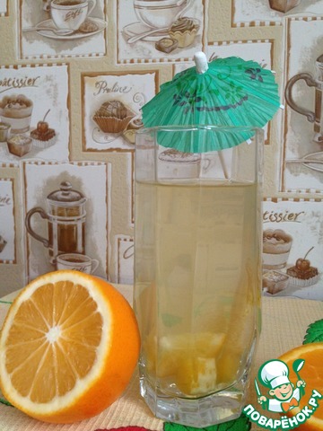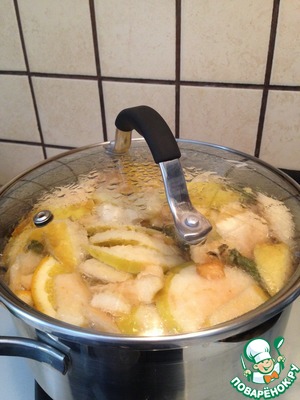 Яблоко, лимон, очищенный апельсин нарезать и положить в кастрюлю с водой. Туда же положить кусочек корицы, лимонную траву (я нарезаю ее на кусочки по 3-4 см), веточку мяты. Мята у меня сушеная, можно использовать и свежую. Поставить на огонь и довести до кипения.
