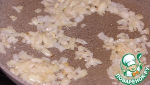 На раскаленную сковороду с растительным маслом кладем лук и обжариваем до полупрозрачности и легкой золотистости (примерно 2 минуты).