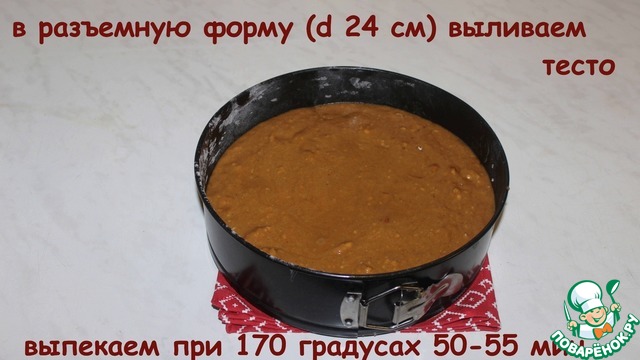 В разъемную форму (диаметр 24 см) выливаем тесто. Выпекаем при температуре 170 градусов 50-55 минут.