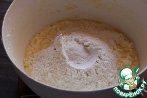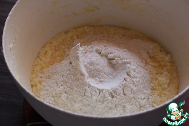 Всыпать муку, смешанную с разрыхлителем, хорошо смешать до однородной массы.