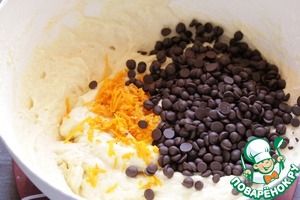 Добавить в тесто апельсиновую цедру и шоколадные капли (или нарубленный шоколад), перемешать.
