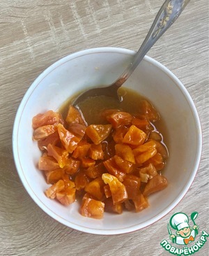 В отдельной миске смешайте крупно нарезанную курагу, мед, и сок одного мандарина.