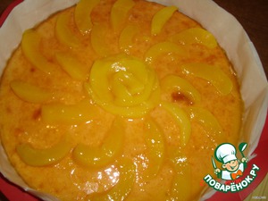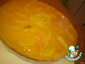 корж верхний смазать тонким слоем желе и выложить из персиков украшение (у меня получилась по центру розочка) -
