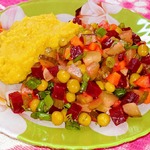 Свекольный салат с солененьким огурцом и с густой гороховой пастой.