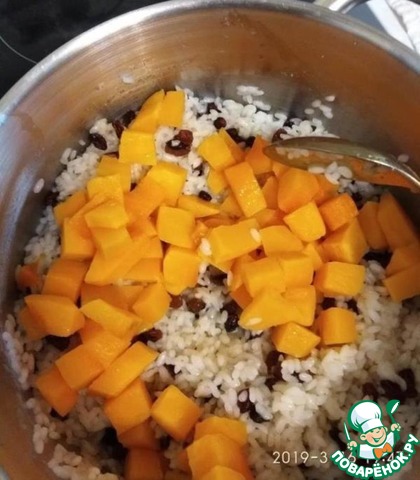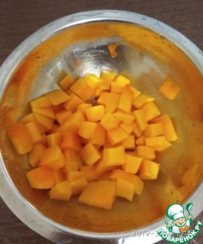 Нарезаем кубиками тыкву. Я брал осеннюю заготовку. По осени нарезали кубиками тыкву и замораживали ее. Куски правда крупноватые, но не страшно.