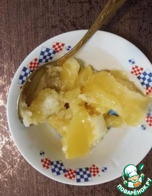 Достаем горячий пирог. Смазываем верх куском масла и медом.