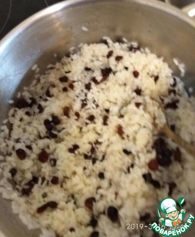 Выкладываем изюм в кастрюлю, добавляем мед. Кастрюля на теплой плите, пассированный изюм имеет привычку застывать и становиться твердым.