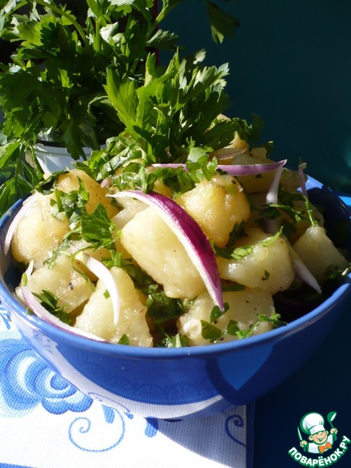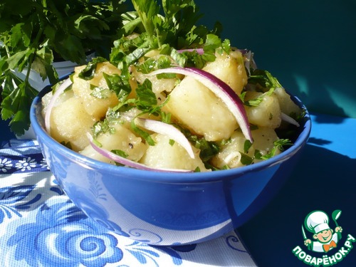 Этот рецепт, при минимуме ингредиентов, позволяет приготовить аппетитное блюдо. Салат получается ароматным, интересным на вкус и сытным. Картофельный салат может сочетаться с мясными ингредиентами либо не сочетаться. И это — вовсе не обязательно закуска, хоть мы и привыкли считать, что салат является только лишь дополнением к главному блюду. Он может быть самостоятельным блюдом. Особенно хорош такой салат для быстрого перекуса: если картофель отварить заранее, приготовление займет не много времени.