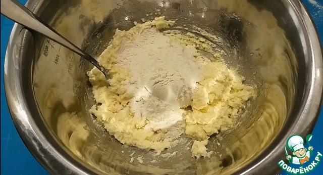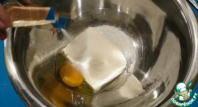 В миске смешайте творог, яйцо, ванильный сахар, щепотку соли и сахар. Хорошо разомните все вилкой до однородной массы.