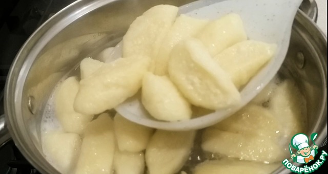 В кипящую воду отправьте ленивые вареники, аккуратно ложкой перемешайте, чтобы они не прилипли ко дну кастрюли.