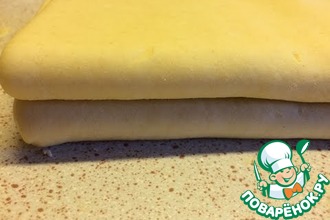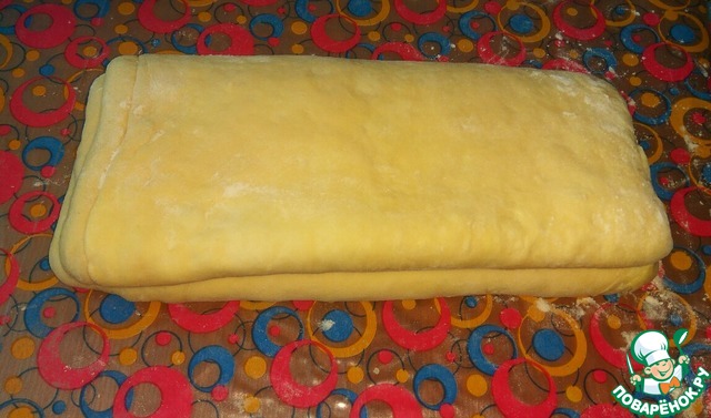 Присыпать мукой и раскатать в третий раз в прямоугольник 50*30 см. Сложить книжкой, затем пополам. Замотать в пищевую плёнку и убрать в холодильник на 30 минут или в морозилку на хранение до нужного момента.