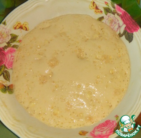 В 100 мл теплого молока развести дрожжи, 1 ч л сахара и 1 ст л муки от общего количества. Оставить в теплом месте.