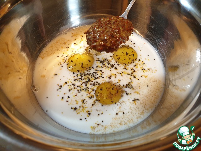 Добавьте молоко, специи и горчицу (у меня зерновая, но это необязательно). Взбейте вилкой или венчиком.